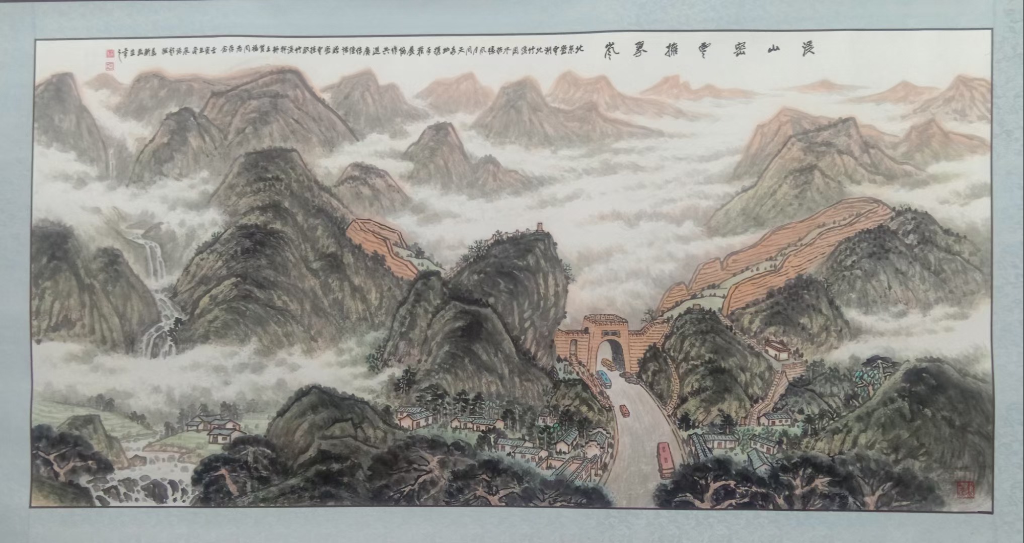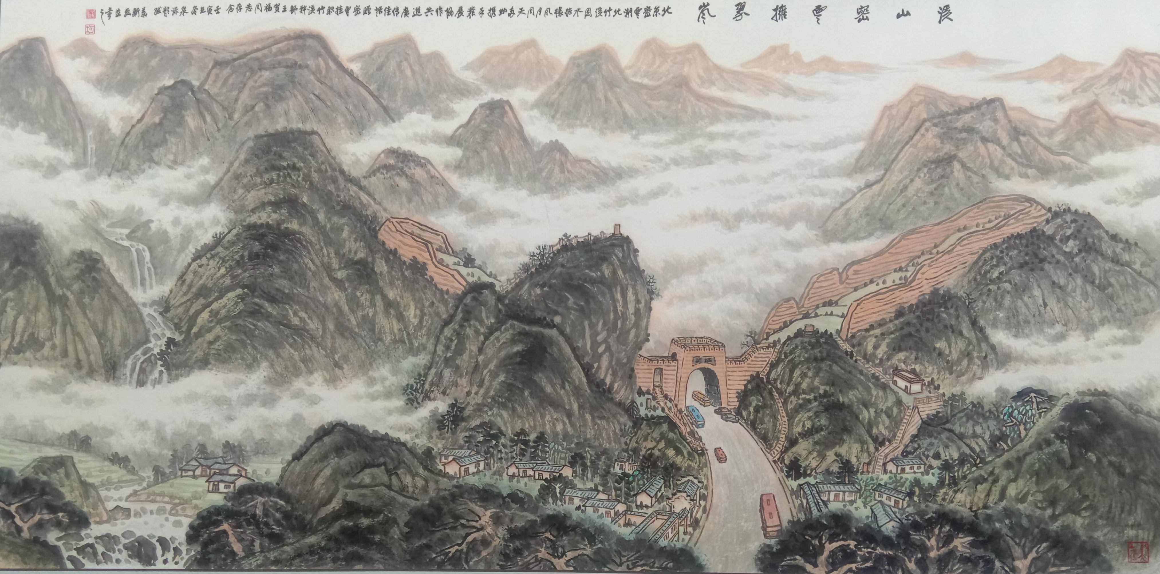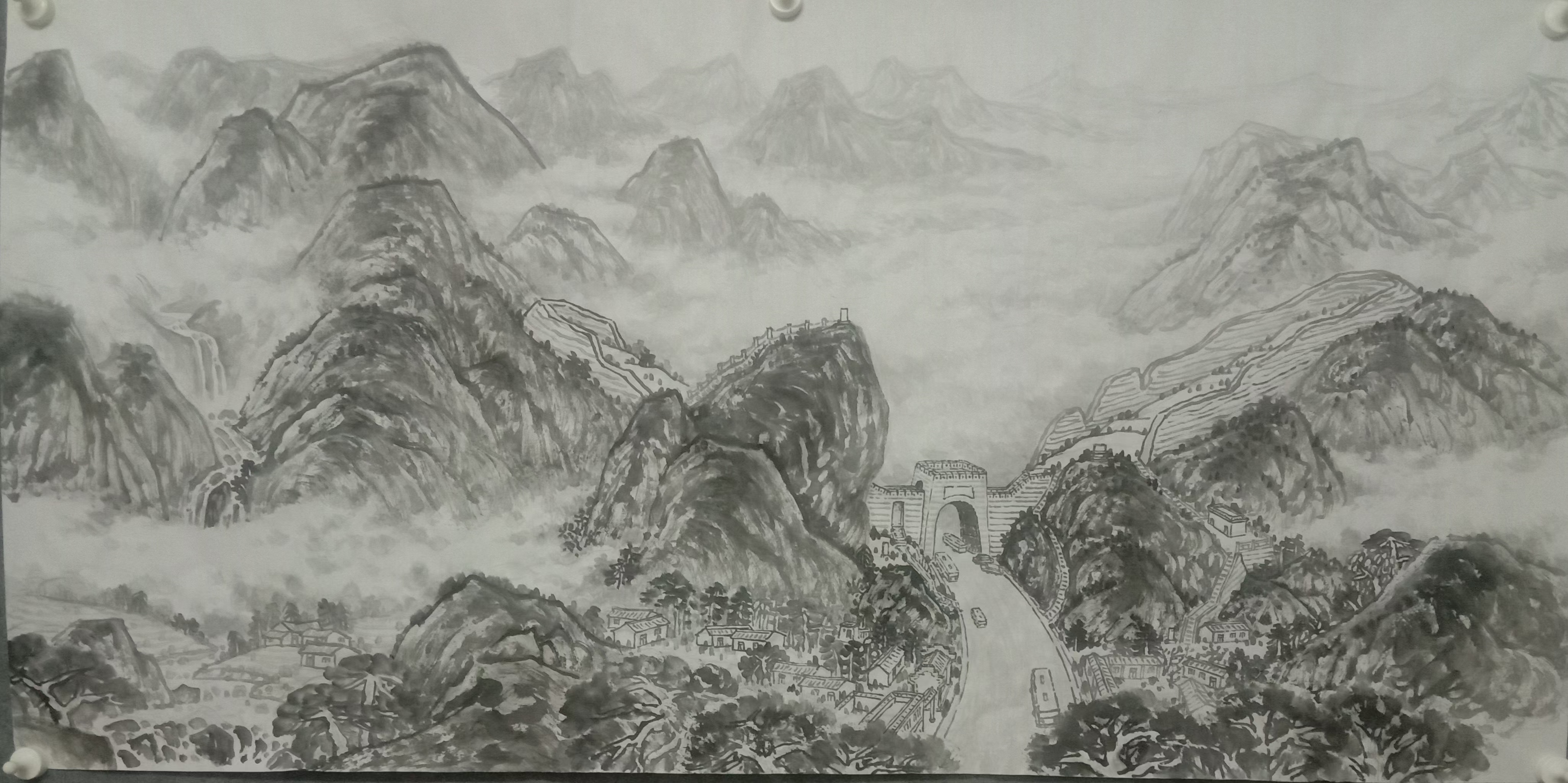 壬寅冬月中旬,竹溪县新冠疫情肆虐,本人每天赴社区防守,下班回家后,赶画四尺全开任务画一幅,再现竹溪关垭风华,今立照存念。依次是墨稿、彩稿、裱后成品效果。