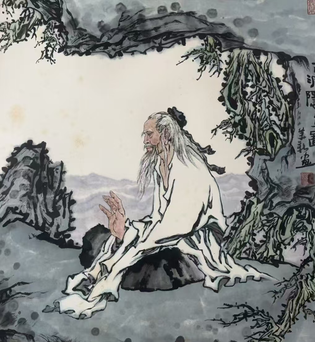 这是二十多年前我画的人物画《古洞隐真图》,那个阶段我正在阅读《金刚经》和六祖《坛经》,绘画上痴迷古装人物画,尤喜任伯年和范曾画风,心摹手追,练就了不用打稿直接用毛笔在宣纸上白描勾画古装人物的本领。一天,我翻阅《竹溪县志》舆图部分,其中有竹溪八景之一古洞隐真图,描绘了唐仙人吕洞宾在竹溪修道的遗迹,不禁心有所感,一种创作的冲动袭上心头,于是铺纸展毫,泼墨作画,洒然挥就,如有神助,不知不觉间,仙人神貌,跃然纸上,遂成此图。继之此画参加了县文化馆承办的书画展览。闭展那天,文友徐君索要此图,慨然赠之。万没想到,二十多年后的今天,徐君将保存至今的作品拍照发来,以示对我创作的爱惜和珍重。吾友徐君,有心人也。