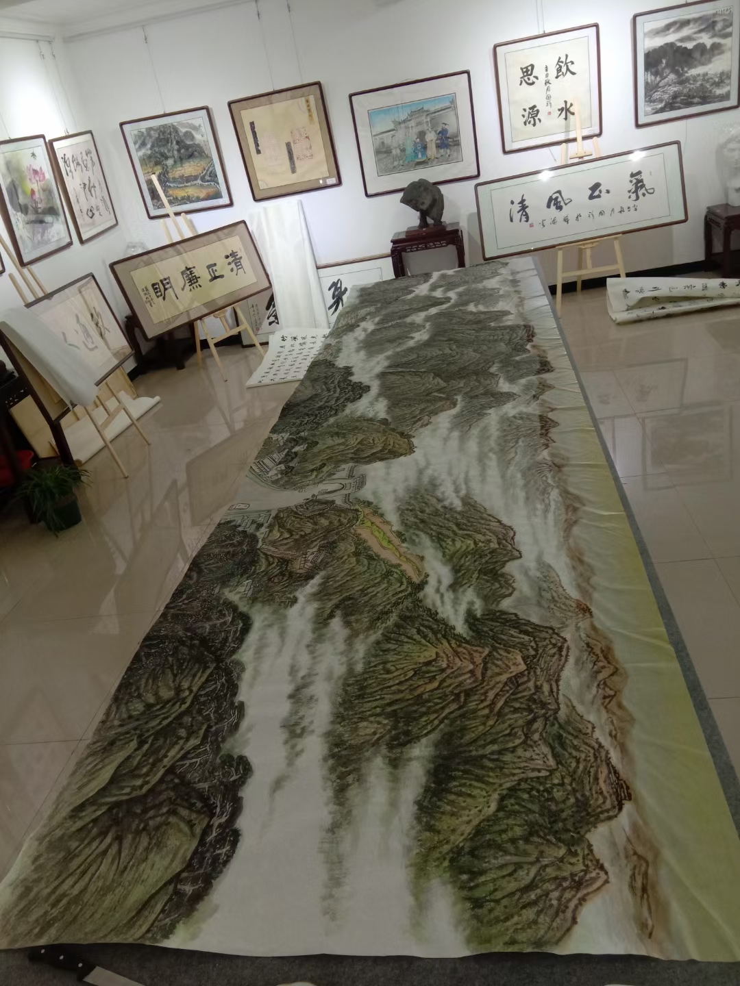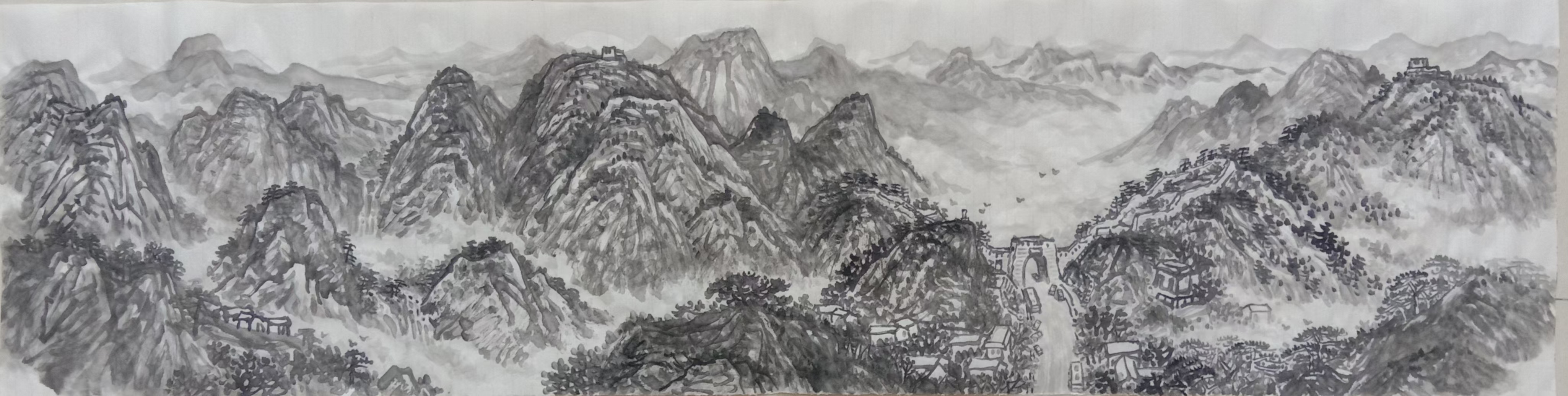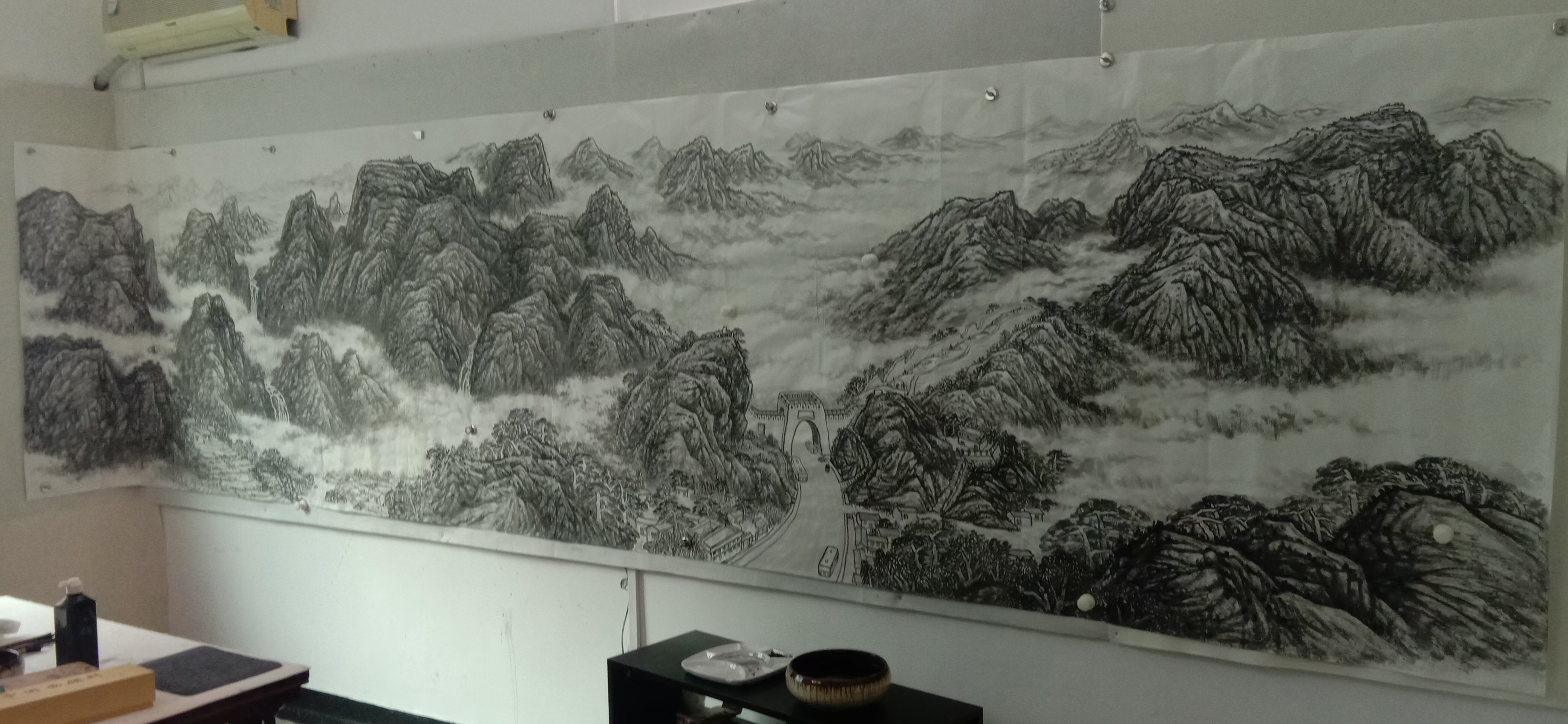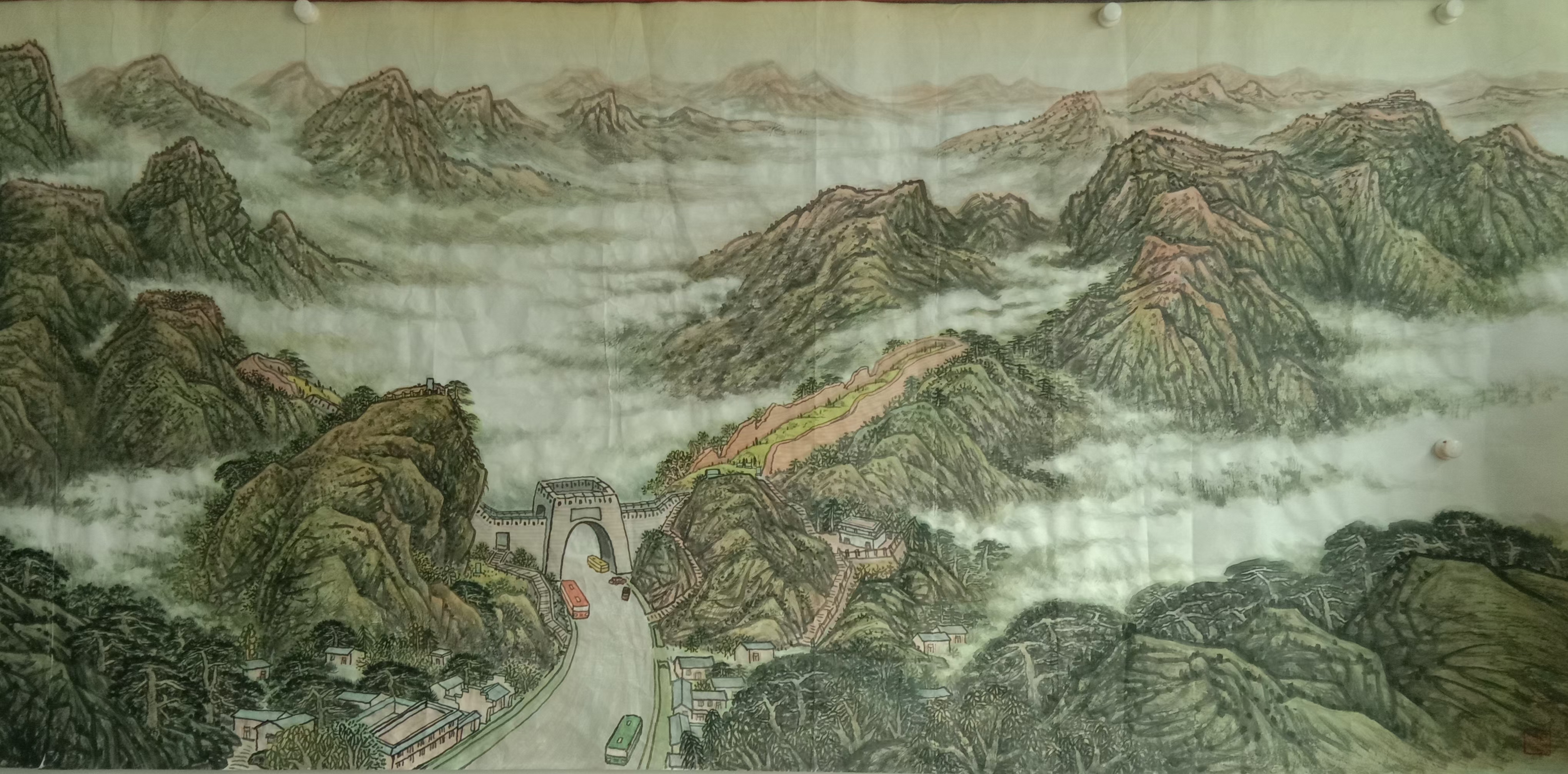 《关垭清晖图》丈六大幅山水画创作阶段完美收官。自接收创作任务,我和常青兄即进入紧张的准备阶段,经过反复切磋,确定作品主题,形式内容,色彩设计。作品拟以湖北西部门户,亦竹溪县名片的关垭为创作的主题内容,色彩
